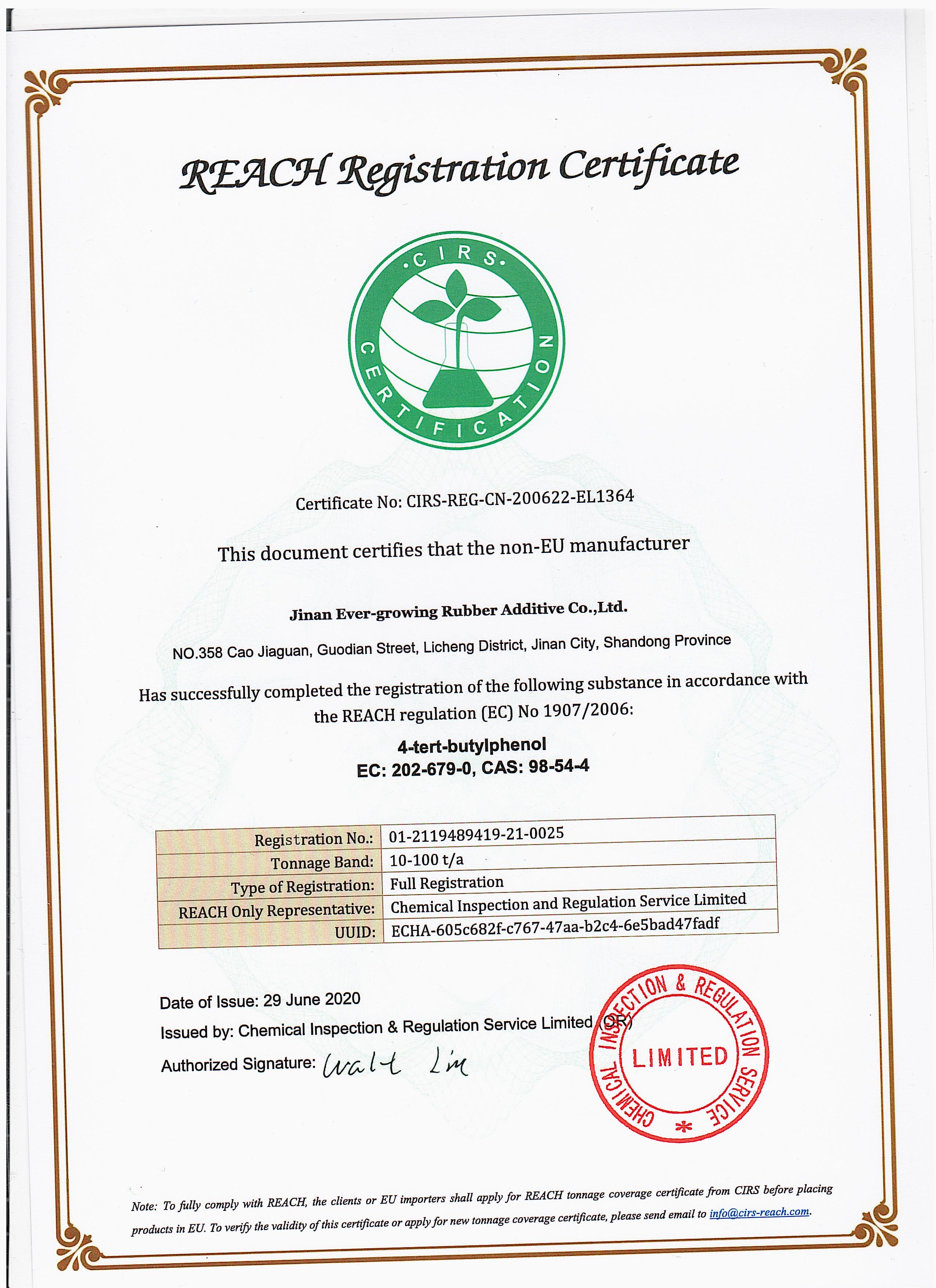 • reach 注冊證書  對叔丁基苯酚reach 注冊證書 對叔丁基苯酚