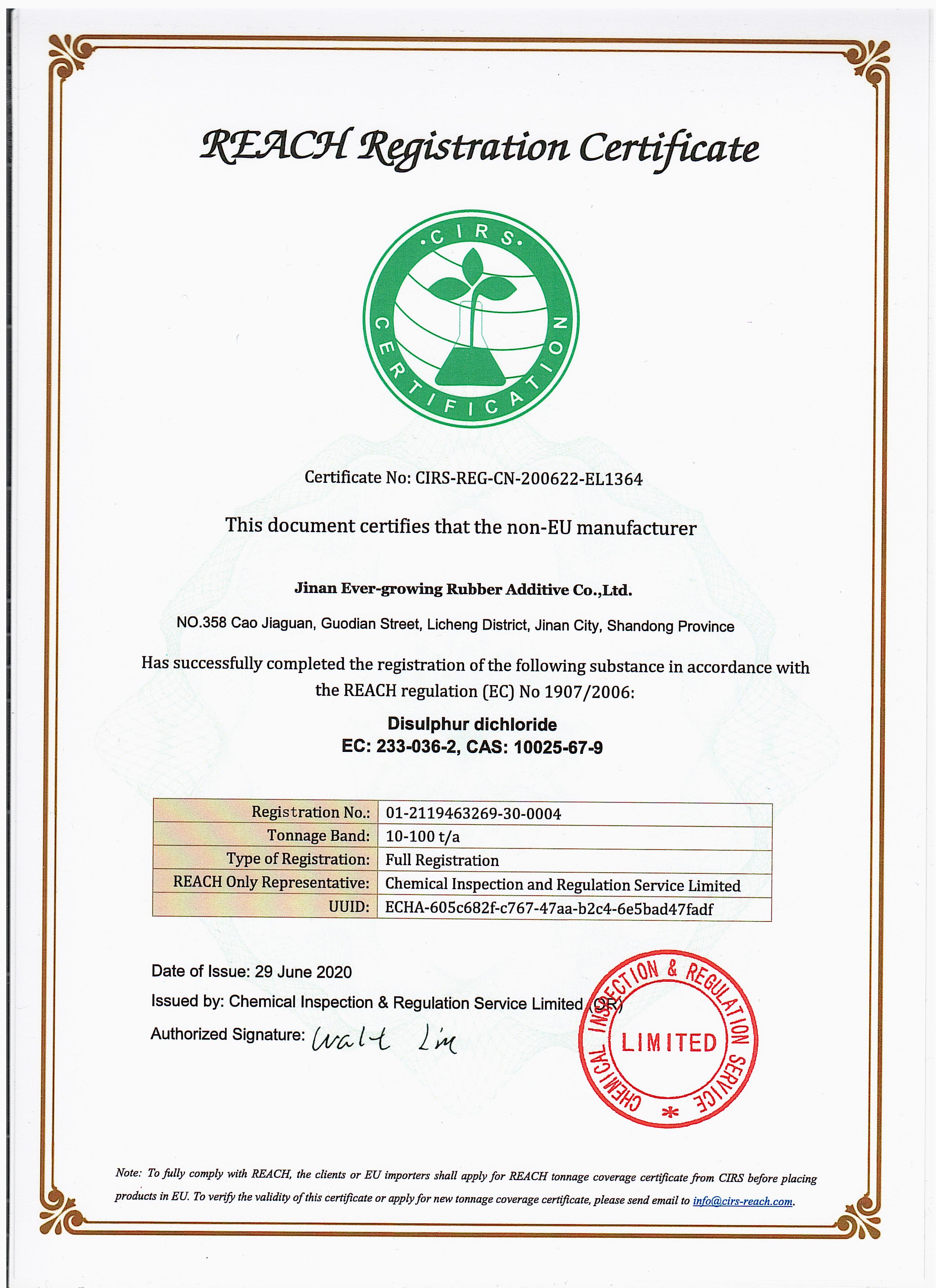 • reach 注冊證書  一氯化硫reach 注冊證書 一氯化硫